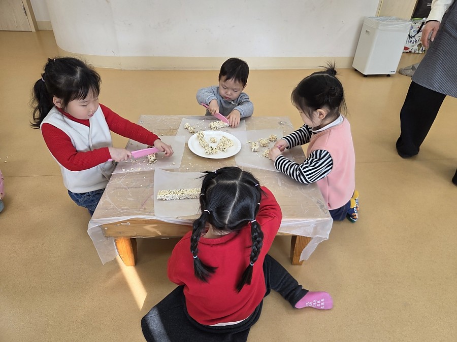 아이들은 강정이 어떻게 만들어지는지 알아본 뒤, 선생님의 도움으로 섞인 재료의 모양을 만들며 즐겁게 활동에 참여하였습니다.