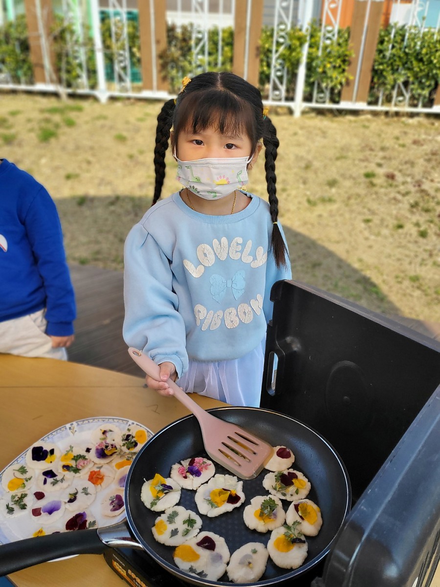 봄을 느낄 수 있는 감성놀이로 화전 만들기 활동을 했습니다. 쑥과 식용 꽃을 활용해 아이들과 함께 예쁜 화전을 만들어 보았습니다.